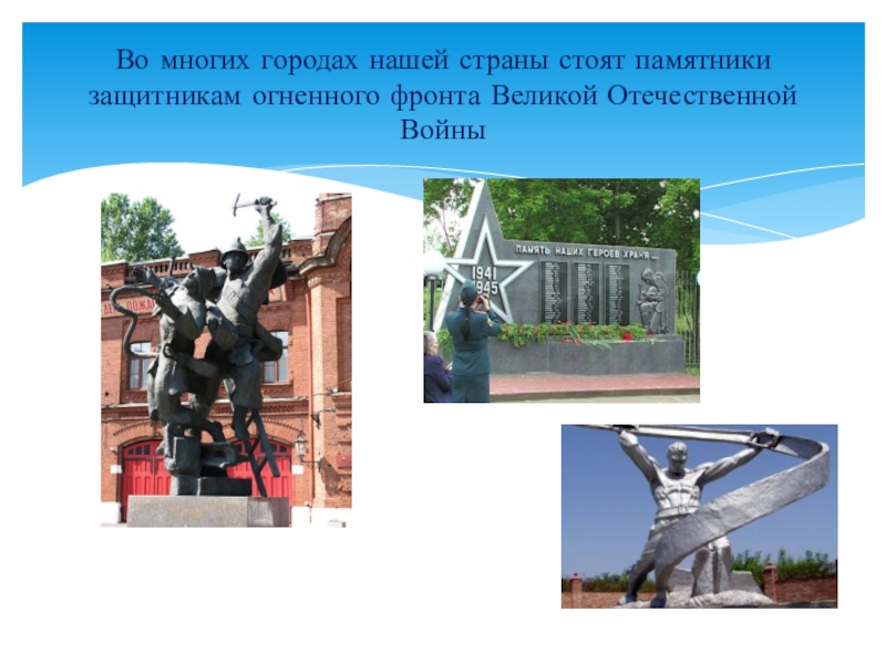 Слайд 29Во многих городах нашей страны стоят памятники защитникам огненного фронта Великой