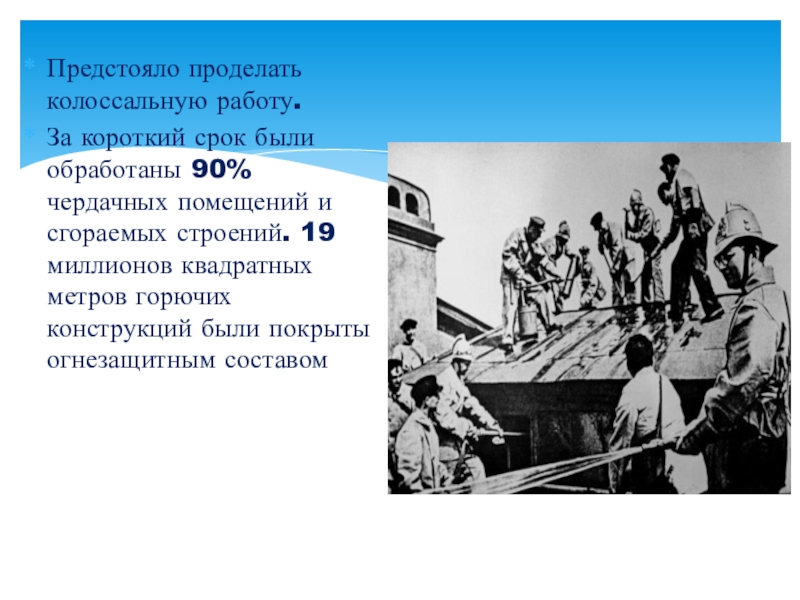 и сгораемых строений. 19 миллионов квадратных метров горючих конструкций были покрыты огнезащитным составом