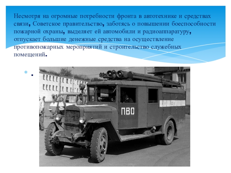 правительство, заботясь о повышении боеспособности пожарной охраны, выделяет ей автомобили и радиоаппаратуру, отпускает большие денежные средства на осуществление противопожарных мероприятий и строительство служебных помещений.