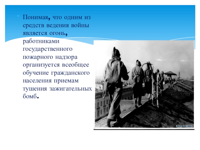 Слайд 8С первых дней войны пожарная охрана была переведена на особый режим