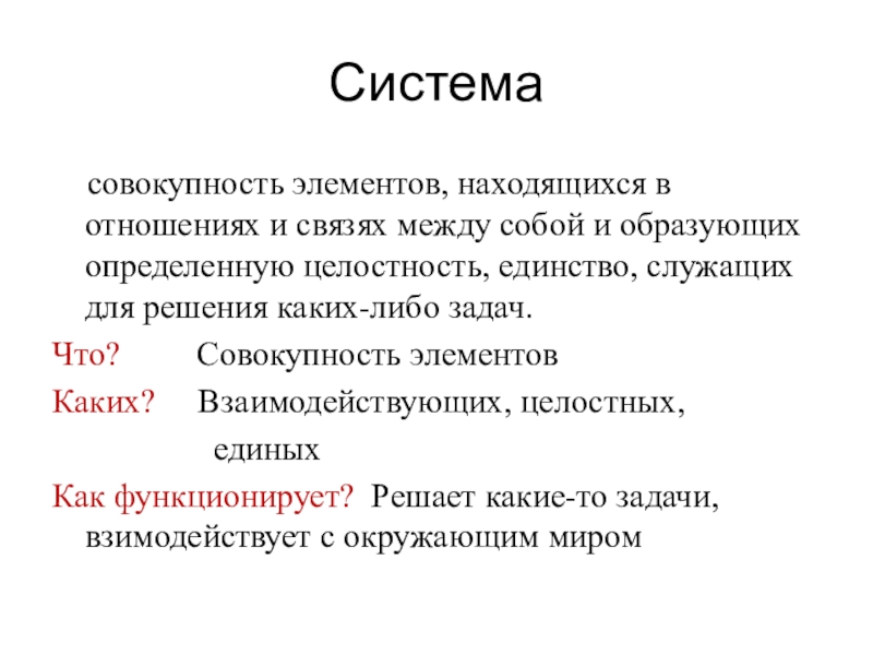 Система  совокупность элементов, находящихся в отношениях и связях между собой и образующих определенную целостность, единство, служащих