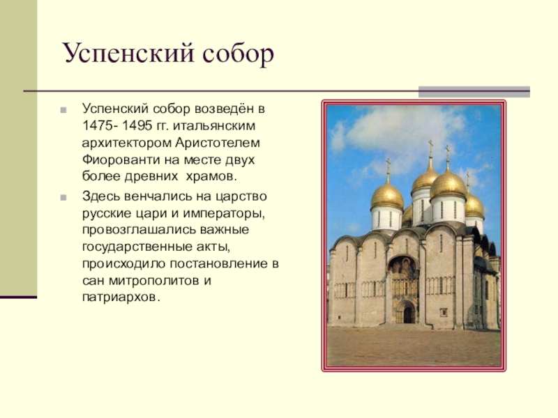 Успенский собор возведён в 1475- 1495 гг. итальянским архитектором
