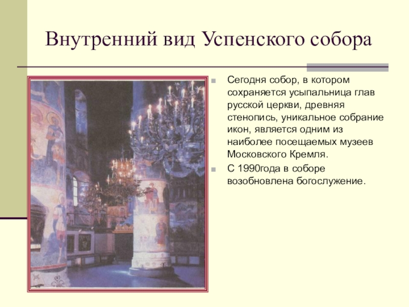 церкви, древняя стенопись, уникальное собрание икон, является одним из наиболее посещаемых музеев Московского Кремля.