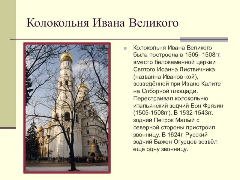 Колокольня Ивана Великого была построена в 1505- 1508гг. вместо