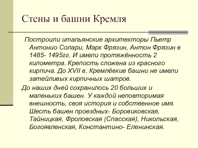 Фрязин, Антон Фрязин в 1485- 1495гг. И имели протяжённость 2 километра. Крепость сложена из красного кирпича. До ХVII в. Кремлёвкие башни не имели затейливых кирпичных шатров.