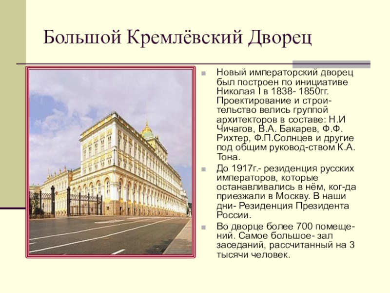 До 1917г.- резиденция русских императоров, которые останавливались в нём, ког-да приезжали в Москву. В наши дни- Резиденция Президента России.