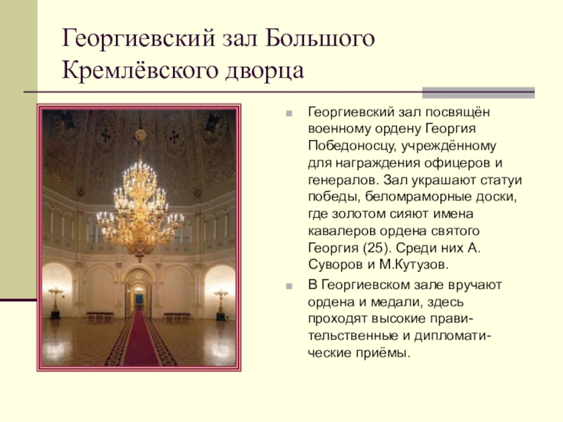 учреждённому для награждения офицеров и генералов. Зал украшают статуи победы, беломраморные доски, где золотом сияют имена кавалеров ордена святого Георгия (25). Среди них А.Суворов и М.Кутузов.