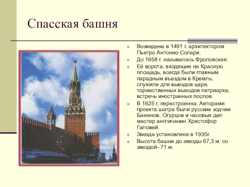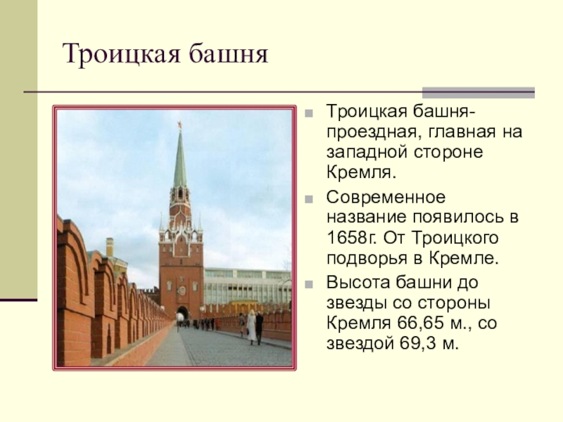 Слайд 8Троицкая башня- проездная, главная на западной стороне Кремля.