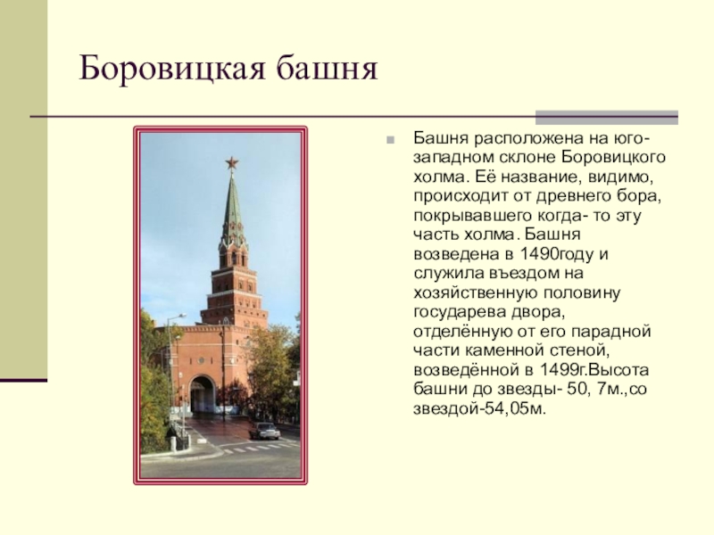 происходит от древнего бора, покрывавшего когда- то эту часть холма. Башня возведена в 1490году и служила въездом на хозяйственную половину государева двора, отделённую от его парадной части каменной стеной, возведённой в 1499г.Высота башни до звезды- 50, 7м.,со звездой-54,05м.