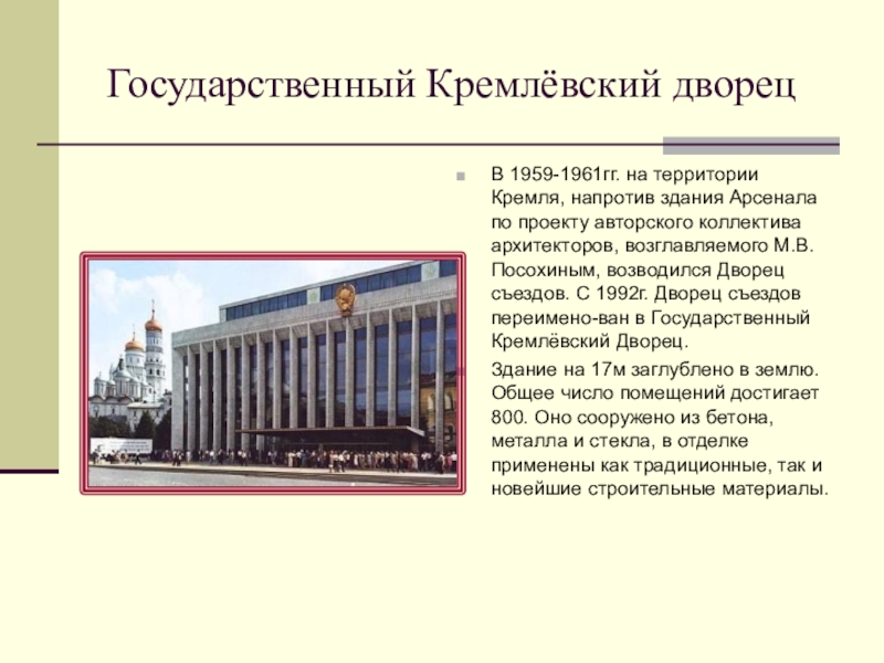 по проекту авторского коллектива архитекторов, возглавляемого М.В.Посохиным, возводился Дворец съездов. С 1992г. Дворец съездов переимено-ван в Государственный Кремлёвский Дворец.