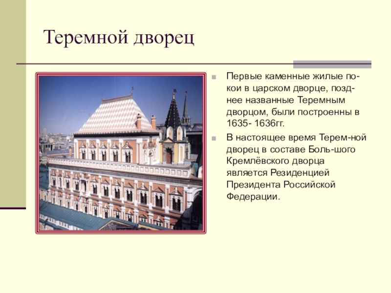 Первые каменные жилые по-кои в царском дворце, позд-нее названные Теремным