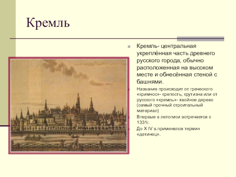 Кремль- центральная укреплённая часть древнего русского города, обычно расположенная на высоком