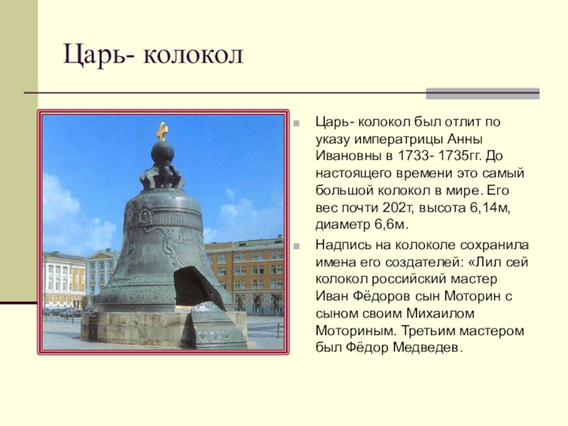 1733- 1735гг. До настоящего времени это самый большой колокол в мире. Его вес почти 202т, высота 6,14м, диаметр 6,6м.