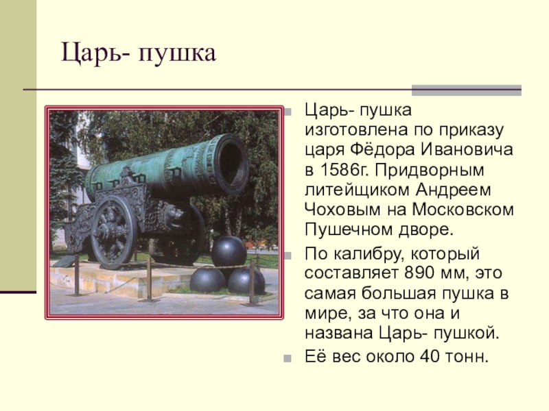 Царь- пушка изготовлена по приказу царя Фёдора Ивановича в 1586г.