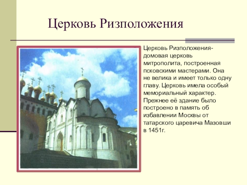 мастерами. Она не велика и имеет только одну главу. Церковь имела особый мемориальный характер. Прежнее её здание было построено в память об избавлении Москвы от татарского царевича Мазовши в 1451г.