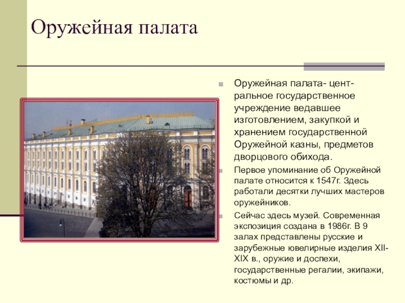 Первое упоминание об Оружейной палате относится к 1547г. Здесь работали десятки лучших мастеров оружейников.