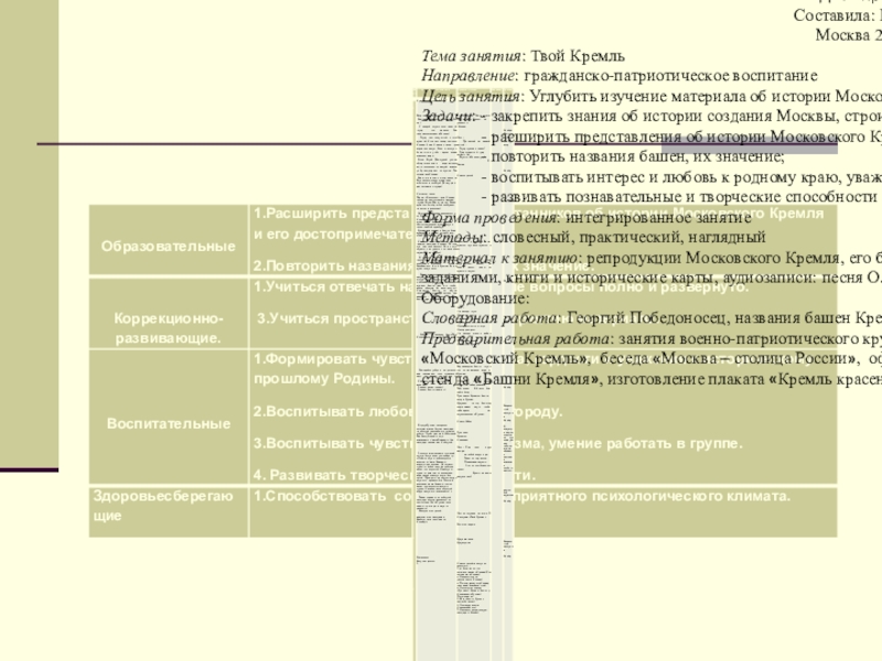 Предварительная работа: занятия военно-патриотического кружка «Патриот», просмотр альбомов и репродукций «Московский Кремль», беседа «Москва – столица России», оформление рисунков «Твой Кремль», оформление стенда «Башни Кремля», изготовление плаката «Кремль красен и велик»