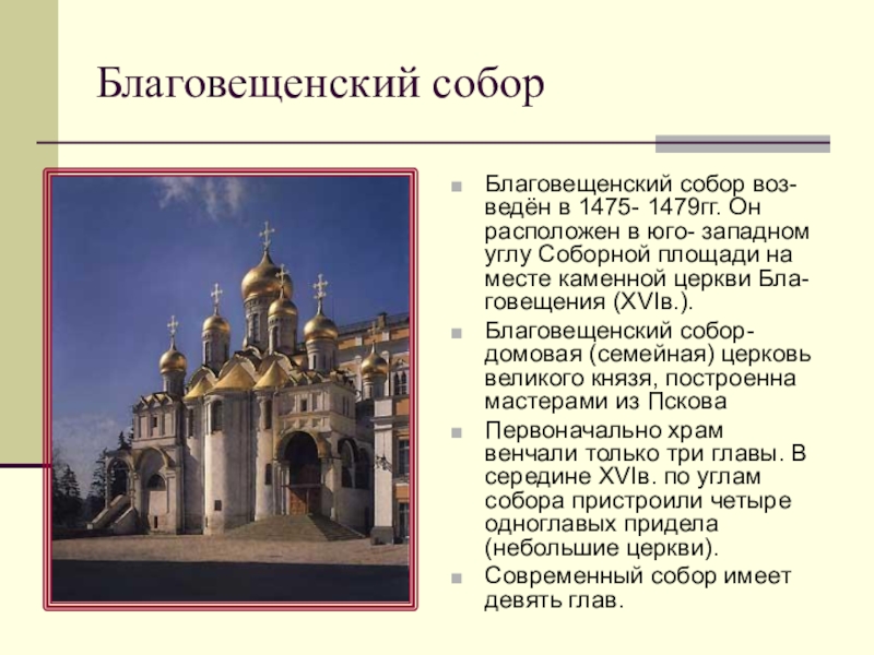 Благовещенский собор воз-ведён в 1475- 1479гг. Он расположен в юго-