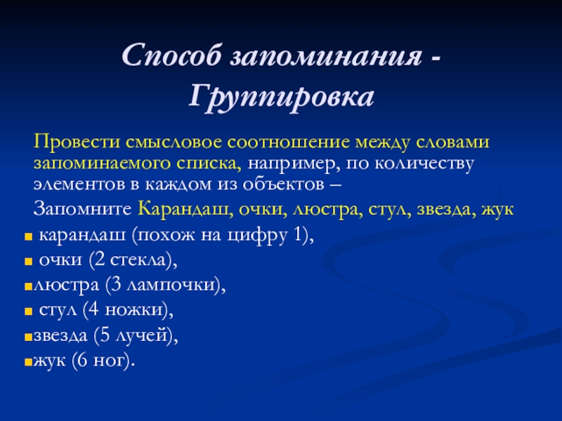 Вспомнить их вы сможете опять представив себя обходящим комнату, — предметы будут на тех местах, где вы их расположили при предыдущем «обходе».