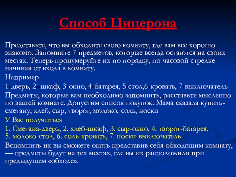 Предметы, которые вам необходимо запомнить, расставьте мысленно по вашей комнате. Допустим список покупок. Мама сказала купить- сметану, хлеб, сыр, творог, молоко, соль, носки