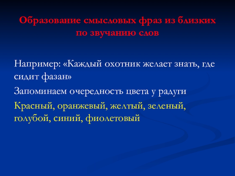 Например: «Каждый охотник желает знать, где сидит фазан»