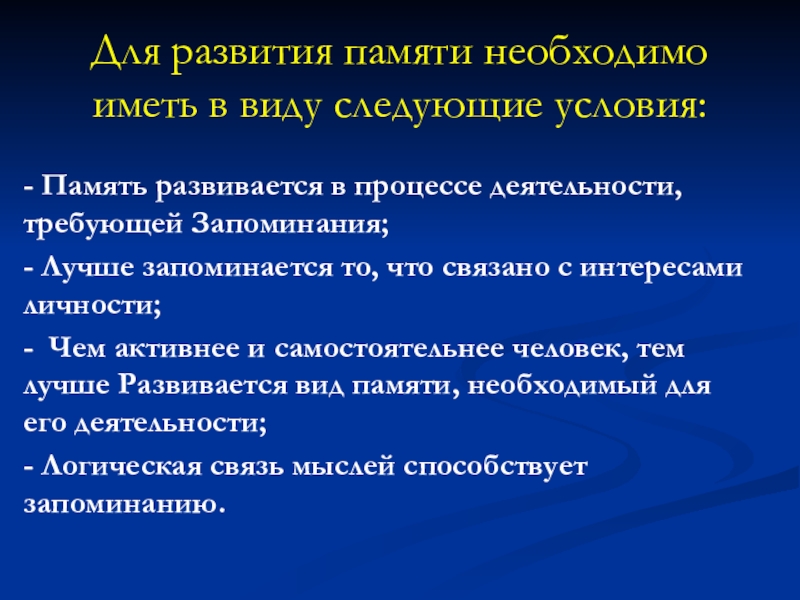Слайд 13Для развития памяти необходимо иметь в виду следующие условия: