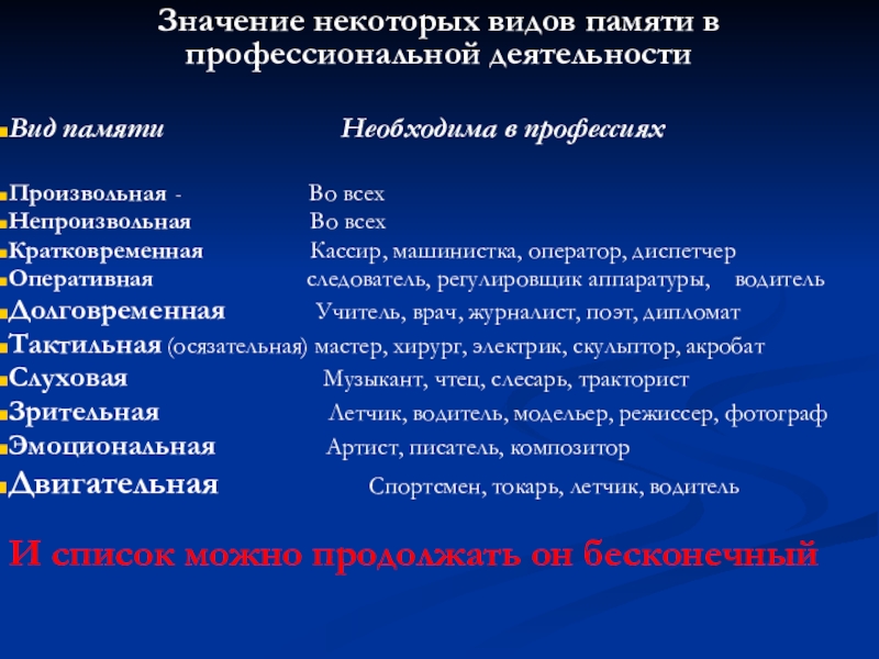 Слайд 9Значение некоторых видов памяти в профессиональной деятельности