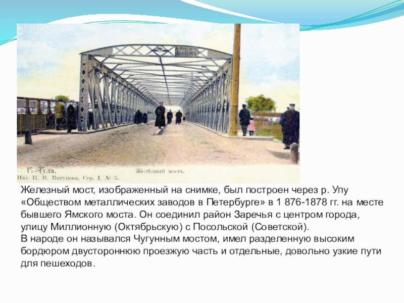 Слайд 4Железный мост, изображенный на снимке, был построен через р. Упу «Обществом