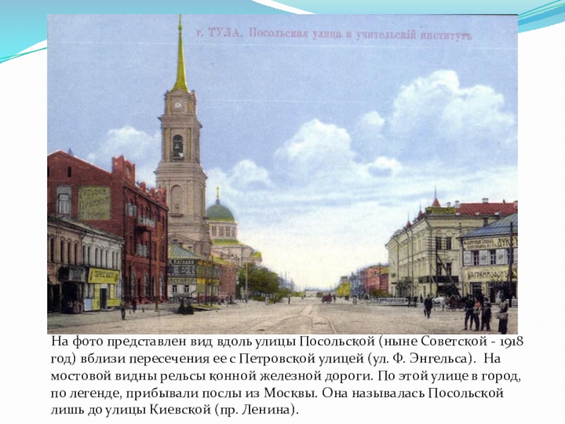 Советской - 1918 год) вблизи пересечения ее с Петровской улицей (ул. Ф. Энгельса). На мостовой видны рельсы конной железной дороги. По этой улице в город, по легенде, прибывали послы из Москвы. Она называлась Посольской лишь до улицы Киевской (пр. Ленина).