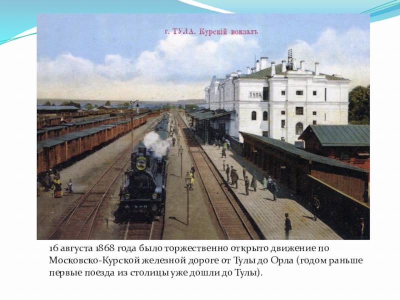 по Московско-Курской железной дороге от Тулы до Орла (годом раньше первые поезда из столицы уже дошли до Тулы).