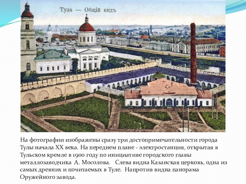 начала XX века. На переднем плане - электростанция, открытая в Тульском кремле в 1900 году по инициативе городского главы металлозаводчика А. Мосолова. Слева видна Казанская церковь, одна из самых древних и почитаемых в Туле. Напротив видна панорама Оружейного завода.