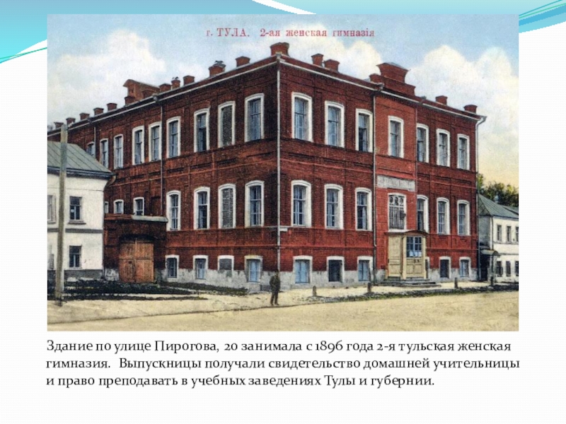 года 2-я тульская женская гимназия. Выпускницы получали свидетельство домашней учительницы и право преподавать в учебных заведениях Тулы и губернии.