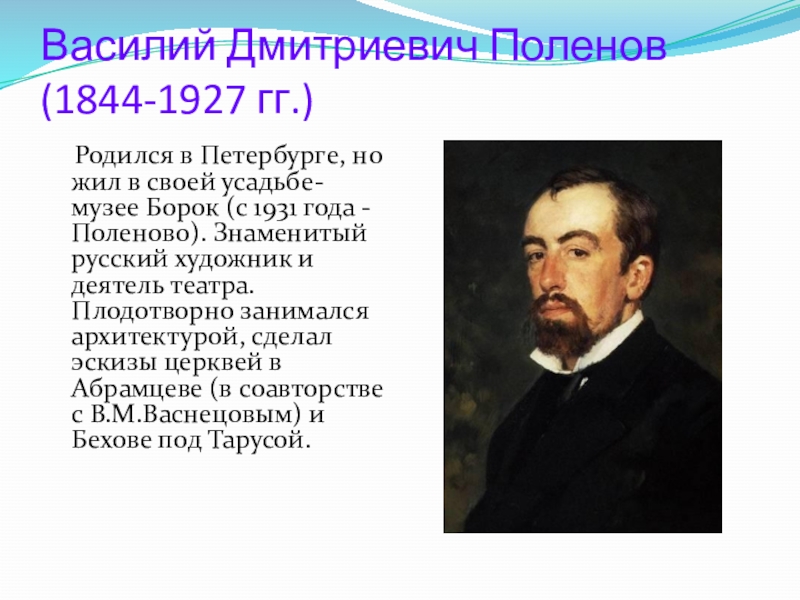 в своей усадьбе-музее Борок (с 1931 года - Поленово). Знаменитый русский художник и деятель театра. Плодотворно занимался архитектурой, сделал эскизы церквей в Абрамцеве (в соавторстве с В.М.Васнецовым) и Бехове под Тарусой.
