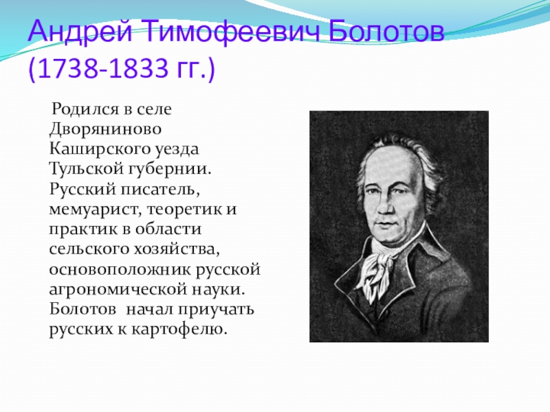 уезда Тульской губернии. Русский писатель, мемуарист, теоретик и практик в области сельского хозяйства, основоположник русской агрономической науки. Болотов начал приучать русских к картофелю.