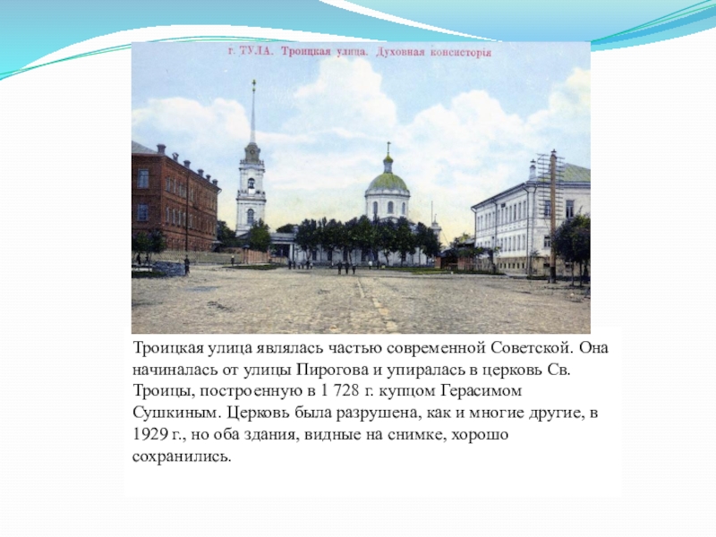 и упиралась в церковь Св. Троицы, построенную в 1 728 г. купцом Герасимом Сушкиным. Церковь была разрушена, как и многие другие, в 1929 г., но оба здания, видные на снимке, хорошо сохранились.