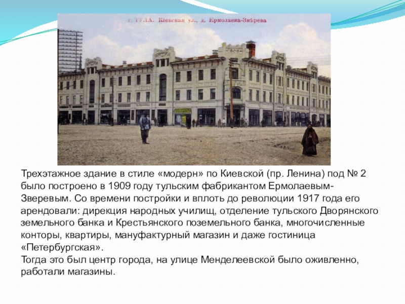 2 было построено в 1909 году тульским фабрикантом Ермолаевым-Зверевым. Со времени постройки и вплоть до революции 1917 года его арендовали: дирекция народных училищ, отделение тульского Дворянского земельного банка и Крестьянского поземельного банка, многочисленные конторы, квартиры, мануфактурный магазин и даже гостиница «Петербургская».