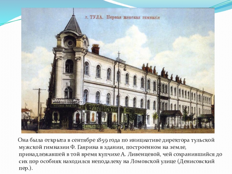 директора тульской мужской гимназии Ф. Гаярина в здании, построенном на земле, принадлежавшей в той время купчихе А. Ливенцевой, чей сохранившийся до сих пор особняк находился неподалеку на Ломовской улице (Денисовский пер.).