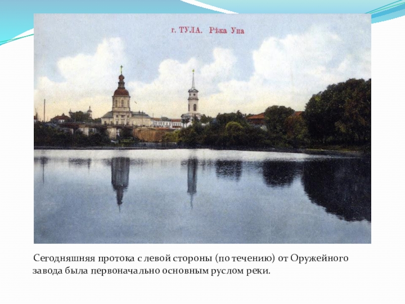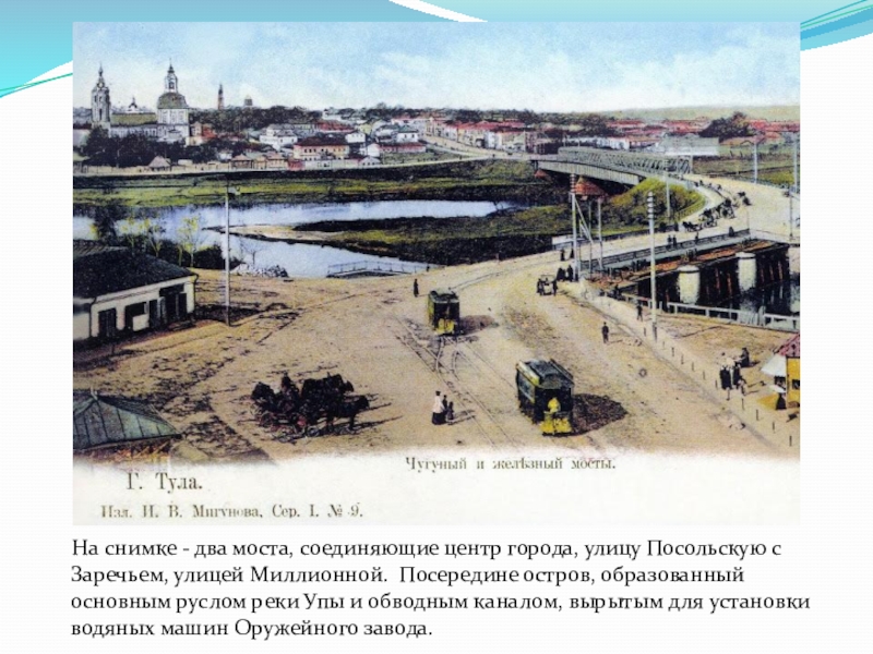 улицу Посольскую с Заречьем, улицей Миллионной. Посередине остров, образованный основным руслом реки Упы и обводным каналом, вырытым для установки водяных машин Оружейного завода.