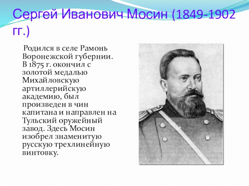 губернии. В 1875 г. окончил с золотой медалью Михайловскую артиллерийскую академию, был произведен в чин капитана и направлен на Тульский оружейный завод. Здесь Мосин изобрел знаменитую русскую трехлинейную винтовку.
