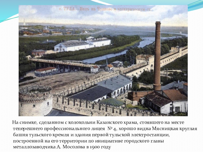 месте теперешнего профессионального лицея № 4, хорошо видна Мясницкая круглая башня тульского кремля и здания первой тульской электростанции, построенной на его территории по инициативе городского главы металлозаводчика А. Мосолова в 1900 году