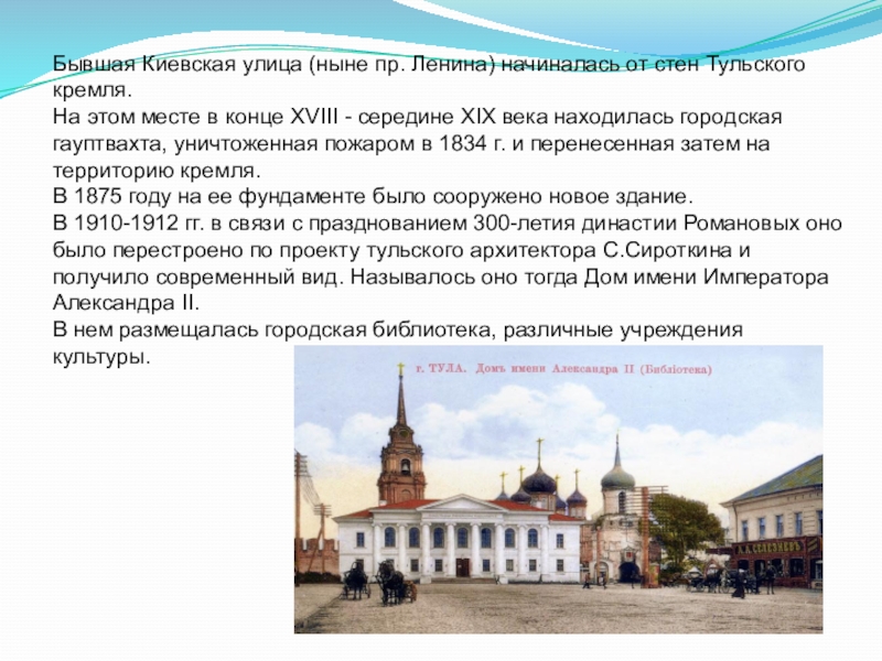В 1910-1912 гг. в связи с празднованием 300-летия династии Романовых оно было перестроено по проекту тульского архитектора С.Сироткина и получило современный вид. Называлось оно тогда Дом имени Императора Александра II.