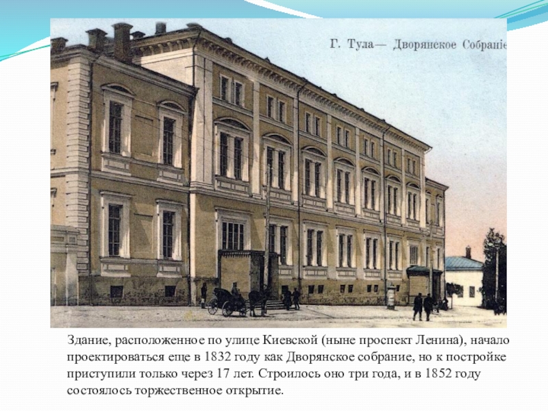 начало проектироваться еще в 1832 году как Дворянское собрание, но к постройке приступили только через 17 лет. Строилось оно три года, и в 1852 году состоялось торжественное открытие.