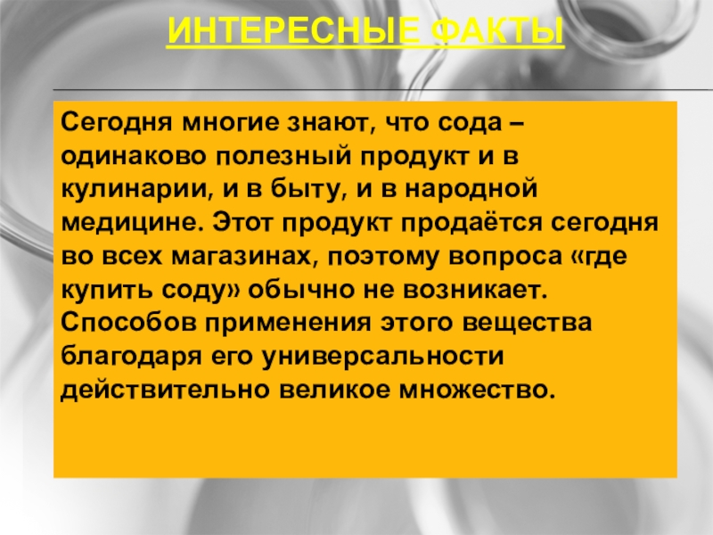 в кулинарии, и в быту, и в народной медицине. Этот продукт продаётся сегодня во всех магазинах, поэтому вопроса «где купить соду» обычно не возникает. Способов применения этого вещества благодаря его универсальности действительно великое множество.