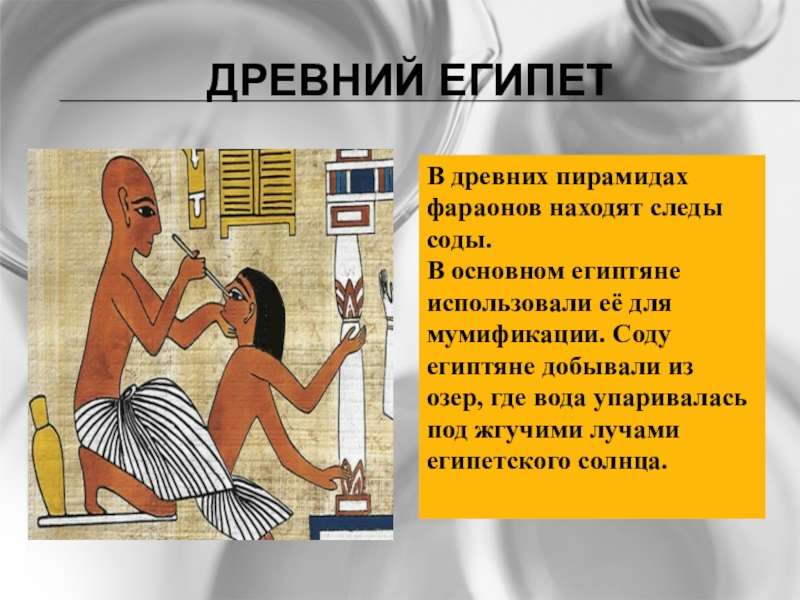 её для мумификации. Соду египтяне добывали из озер, где вода упаривалась под жгучими лучами египетского солнца.