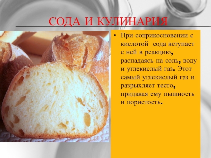 реакцию, распадаясь на соль, воду и углекислый газ. Этот самый углекислый газ и разрыхляет тесто, придавая ему пышность и пористость.