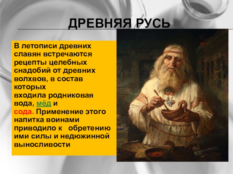 волхвов, в состав которых входила родниковая вода, мёд и сода. Применение этого напитка воинами приводило к обретению ими силы и недюжинной выносливости
