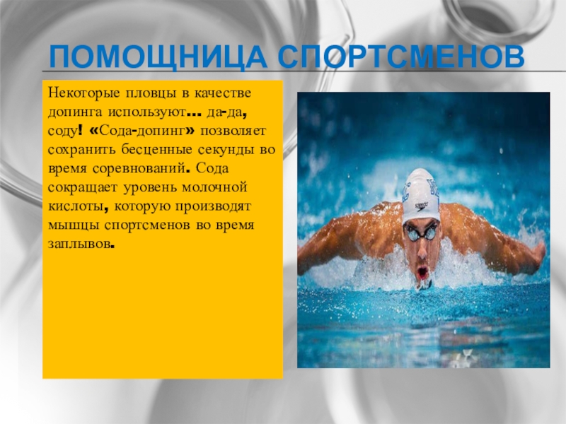 сохранить бесценные секунды во время соревнований. Сода сокращает уровень молочной кислоты, которую производят мышцы спортсменов во время заплывов.