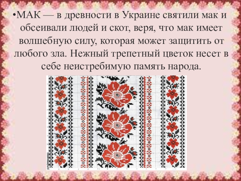 скот, веря, что мак имеет волшебную силу, которая может защитить от любого зла. Нежный трепетный цветок несет в себе неистребимую память народа.