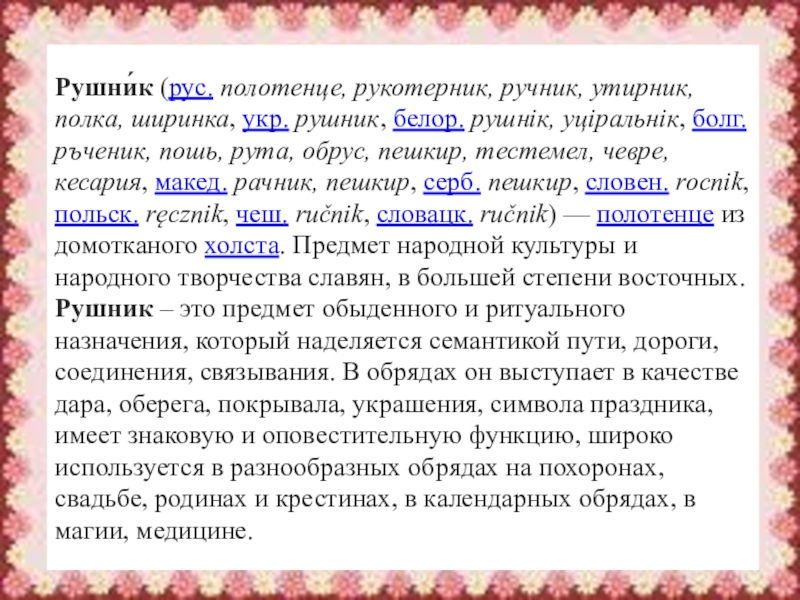 Слайд 4Рушни́к (рус. полотенце, рукотерник, ручник, утирник, полка, ширинка, укр. рушник, белор. рушнік, уціральнік, болг.ръченик, пошь, рута, обрус, пешкир,