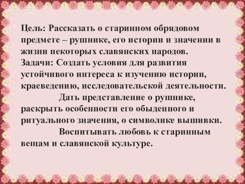 Слайд 2Цель: Рассказать о старинном обрядовом предмете – рушнике, его истории и